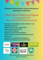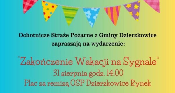 W niedzielę 31 sierpnia wszystkie jednostki Ochotniczej Straży Pożarnej z gminy proponują "Zakończenie wakacji na sygnale". Od 14.00 na placu przy OSP Dzierzkowice-Rynek będą się chwalić sprzętem pożarniczym, a najmłodszych gości zaproszą na "piana party" i do rywalizacji na strażackim torze przeszkód. Natomiast dorośli będą się mogli nauczyć udzielania pierwszej pomocy. Będzie także piknikowe menu, w tym potrawy z grilla i przeróżne słodkości.