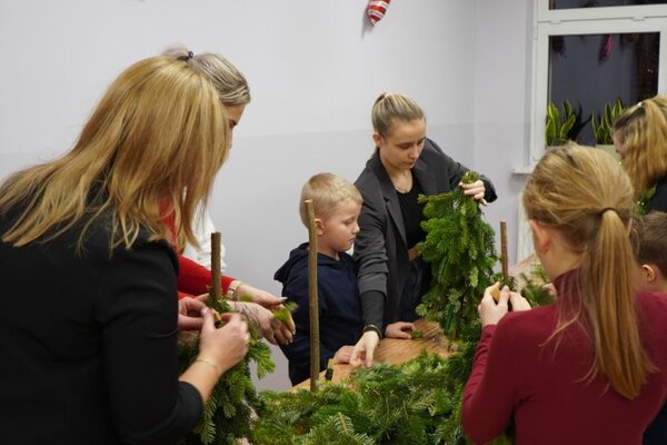 Na warsztatach plastycznych, które poprowadzili animatorzy Sali Zabaw "Kids Park" w Terpentynie, dzieci tworzyły choinki na pniach.