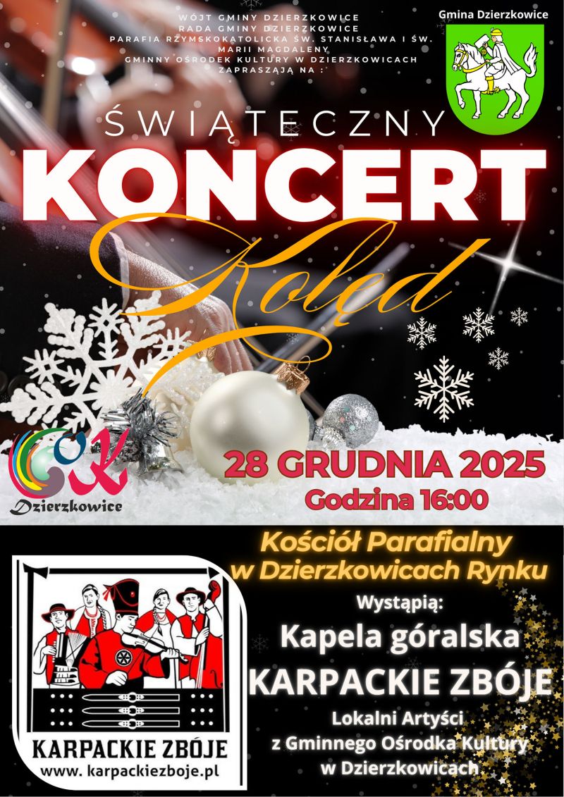 Rozpoczął się okres śpiewania kolęd i pastorałek. Tych w wyjątkowych aranżacjach mieszkańcy Dzierzkowic i okolicznych miejscowości będą mogli posłuchać w poświąteczną niedzielę 28 grudnia. O 16.00 w kościele w Dzierzkowicach Rynku zagrają je i zaśpiewają członkowie Kapeli Góralskiej "Karpackie Zbóje" oraz artyści, związani z Gminnym Ośrodkiem Kultury w Dzierzkowicach.