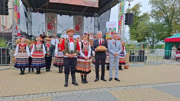 Ceremoniom dożynkowym przewodniczyli starosta i starościna. Tę zaszczytną funkcję pełnili w tym roku Joanna Gęca z Nowin i Łukasz Zarzecki z Głuszczyzny, którzy zgodnie z tradycją na uroczystość w centrum gminy Głusk w Dominowie przyjechali bryczką. Po dotarciu na plac przed urzędem gminy najpierw częstowali gości słodkościami, a potem stanęli na czele korowodu dożynkowego. Ustawiło się w nim 17 delegacji z wieńcami dożynkowymi i koszami, pełnymi warzyw i owoców z miejscowych ogrodów działkowych.