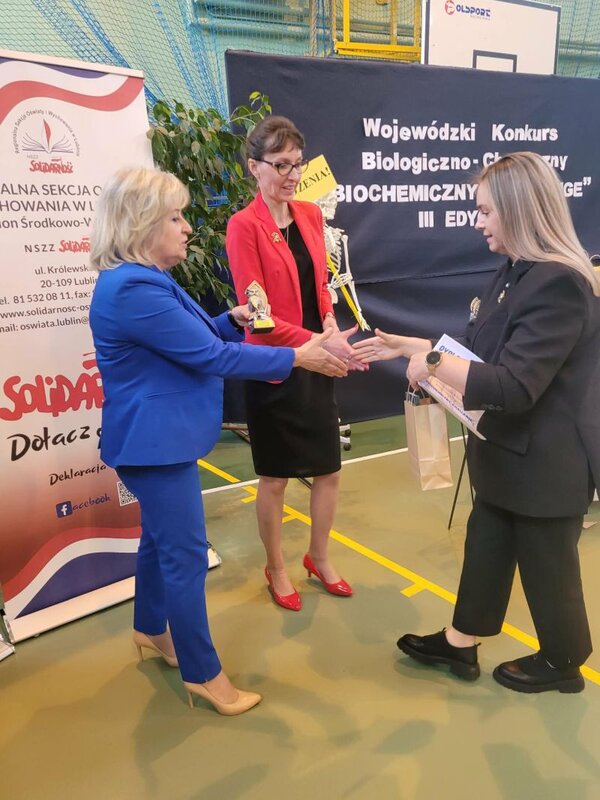 Nagrody młodym biochemikom wręczyli także dyrektor Samorządowego Zespołu Ekonomiczno-Administracyjnego Szkół w Głusku Anna Grzywaczewska, Janusz Olech z NSZZ "Solidarność" Regionu Środkowo-Wschodniego oraz dyrektor PSP w Prawiednikach Monika Flis i pomysłodawczyni konkursu Katarzyna Michotka.