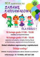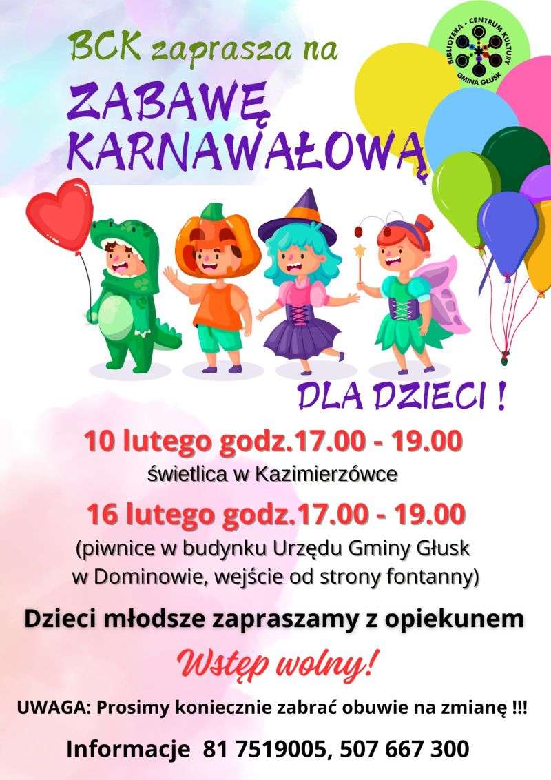 Kulturalną ofertę dla dzieci na najbliższe dni dopełniają dwie zabawy karnawałowe. Pierwsza jest planowana również w Kazimierzóce już we wtorek 10 lutego, zaś druga odbędzie się w Dominowie w poniedziałek 16 lutego. Obydwie rozpoczną się o 17.00, wstęp wolny. Organizatorzy proszą tylko, by młodsze dzieci przyszły z opiekunem, a wszyscy uczestnicy zabrali ze sobą obuwie na zmianę.