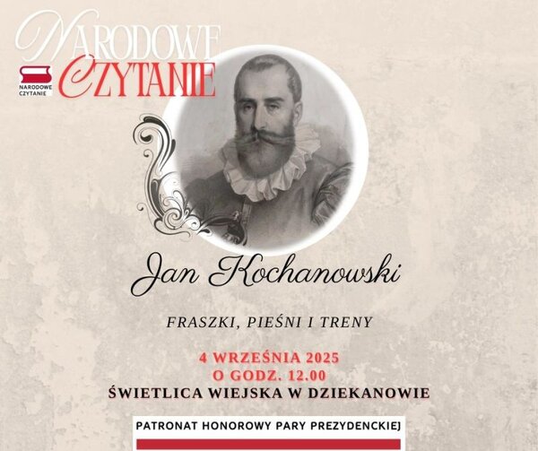 "W tym roku wspólnie będziemy odkrywać piękno i mądrość twórczości jednego z najwybitniejszych poetów polskiego renesansu. Podczas wydarzenia zabrzmią fragmenty jego najbardziej znanych dzieł - fraszek, pieśni i trenów. To wyjątkowa okazja, aby wsłuchać się w słowa, które mimo upływu wieków wciąż poruszają serca i budzą refleksje" - piszą w zaproszeniu organizatorzy "Narodowego Czytania" w gminie Hrubieszów.