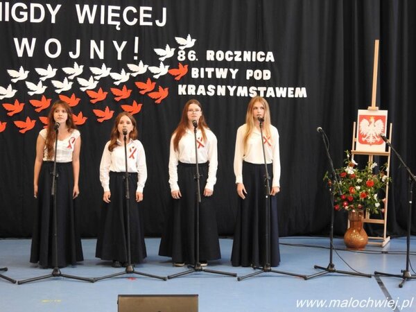 Druga, mniej oficjalna część rocznicowych obchodów odbyła się w szkolnej sali gimnastycznej, gdzie goście wysłuchali pieśni patriotycznych i obejrzeli historyczną wystawę. We wzruszającym koncercie wystąpili: Strażacka Orkiestra Dęta z Tarnogóry, zespół wokalny z I Liceum Ogólnokształcącego im. Władysława Jagiełły w Krasnymstawie, zespół śpiewaczy "Melodia" z Siennicy Nadolnej oraz połączone siły KGW Małochwiej Duży i KGW Zastawie Kolonia i Łany. Występom towarzyszyła wystawa modeli samolotów, okrętów i czołgów z czasu II wojny światowej. Kolekcja, składająca się z około 70 eksponatów, była własnością dziadka jednego z uczniów, którego ojciec Marcin Podgórski przekazał ją szkole w Małochwieju.
