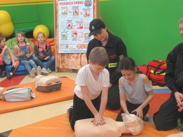 W dalszej części spotkania uczniowie pod czujnym okiem gości i nauczycieli mieli okazję zastosowania zdobytej wiedzy w praktyce, ćwicząc na fantomach. Dzieci z pełnym zaangażowaniem wykonywały poszczególne zadania, utrwalając w ten sposób swoją wiedzę na temat prawidłowego zachowania w sytuacjach zagrażających zdrowiu lub życiu.