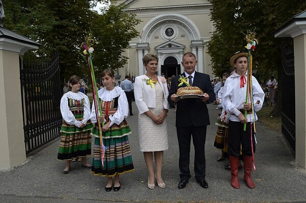 Zgodnie ze zwyczajem przewodniczący Rady Miejskiej w Józefowie Jerzy Hajduk odebrał tradycyjny bochen chleba z rąk starostów dożynkowych. Tym razem tę zaszczytną funkcję pełnili Maria Kudełka ze Stanisławowa i Mariusz Radymiak z Szopowego, którzy częstowali pieczywem z tegorocznych zbóż zebranych na józefowskim rynku mieszkańców i gości.