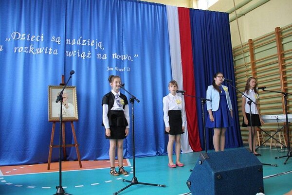 W dalszej części spotkania uczniowie złożyli ślubowanie na nowy sztandar, a całość zakończyła część artystyczna, której mottem były słowa Jana Pawła II: "Dzieci są nadzieją, która rozkwita wciąż na nowo".
