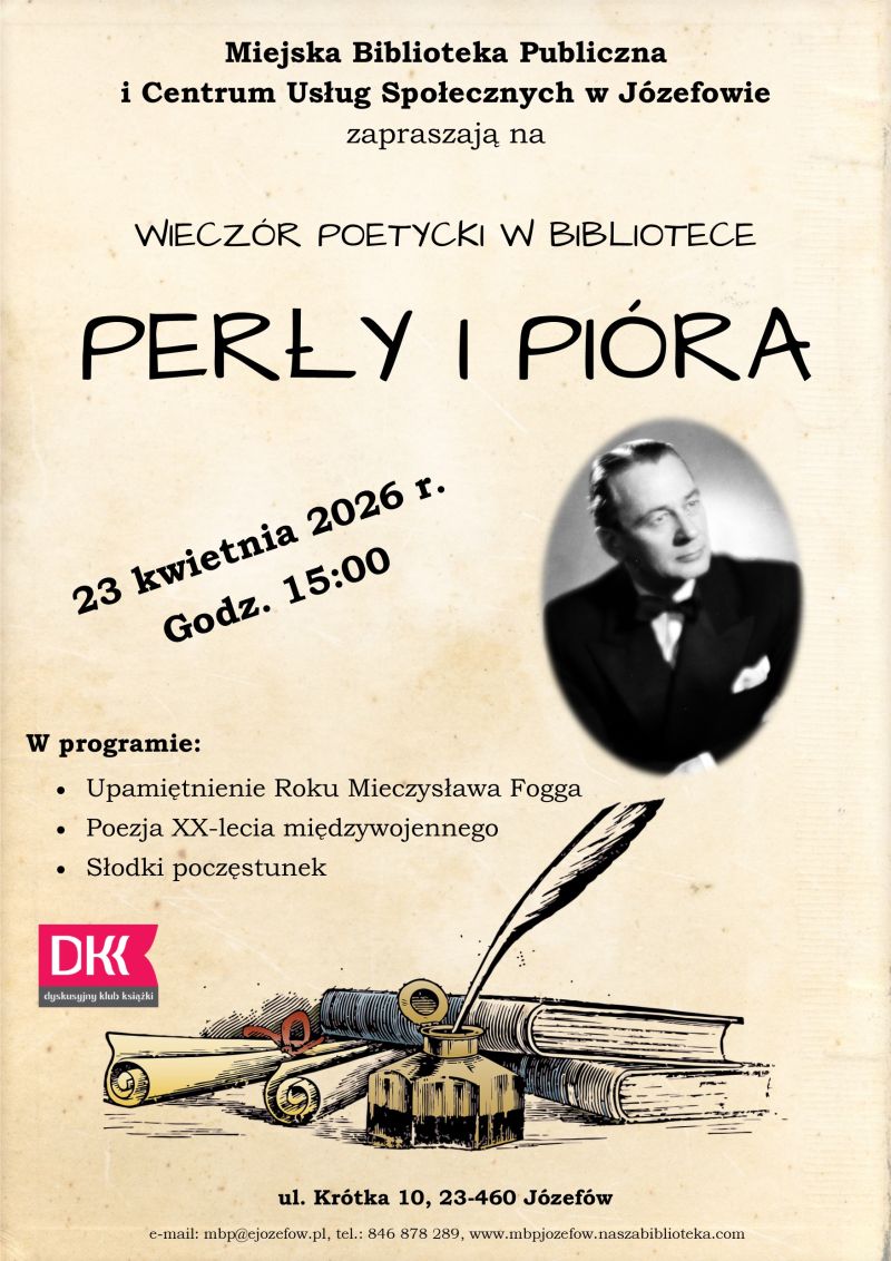 Na wieczór poetycko-muzyczny z piosenkami Mieczysława Fogga zapraszają Miejska Biblioteka Publiczna i Centrum Usług Społecznych w Józefowie. Spotkanie odbędzie się w józefowskiej bibliotece w czwartek 23 kwietnia i wpisuje się w obchody roku jubileuszowego artysty z okazji 125 rocznicy jego urodzin.