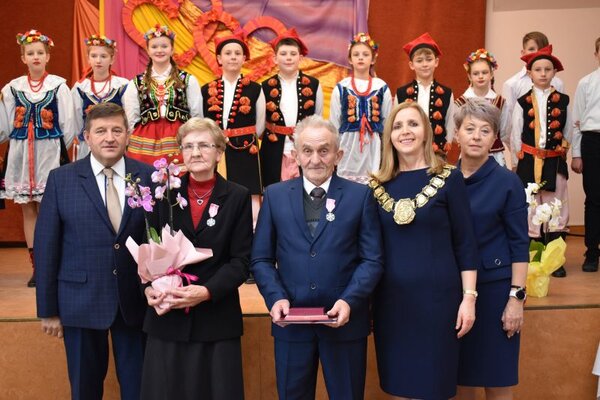 Gratulacje, życzenia i medale za "długoletnie pożycie małżeńskie", wręczali wójt gminy Komarów-Osada Wiesława Sieńkowska i sekretarz Stanisław Siek, którym towarzyszyła kierownik Urzędu Stanu Cywilnego Anna Siek.