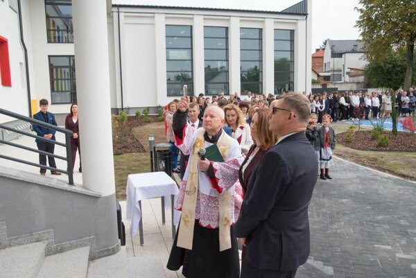 Po symbolicznym przecięciu wstęgi nowoczesne obiekty poświęcił proboszcz miejscowej parafii ksiądz dziekan Franciszek Nieckarz, a dalsza część uroczystości odbyła się w hali sportowej.