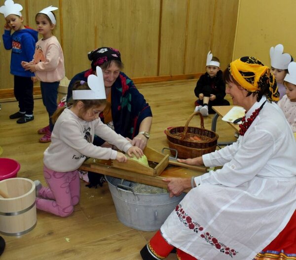 Praca odbywała się w rytm "Kapuścianej piosenki", w której są m.in. słowa: "Szatkownica poszła w taniec.. To ci będzie szatkowanie! Rach, ciach, ciach, obereczka - już kapusty pełna beczka!".