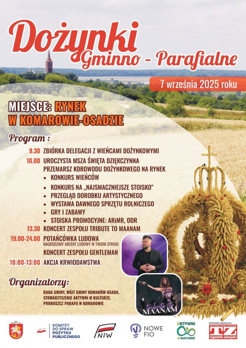 Uczestnicy święta plonów zbiorą się o 9.30 na rynku w Komarowie, a o 10.00 zostanie odprawiona dziękczynna msza święta, połączona z poświęceniem chleba i wieńców dożynkowych. W dorocznym konkursie tradycyjne i współczesne kompozycje zgłosiło kilkanaście grup wieńcowych. Lista laureatów zostanie ogłoszona podczas dożynkowego festynu, który po eucharystii, odbędzie się na komarowskim rynku.