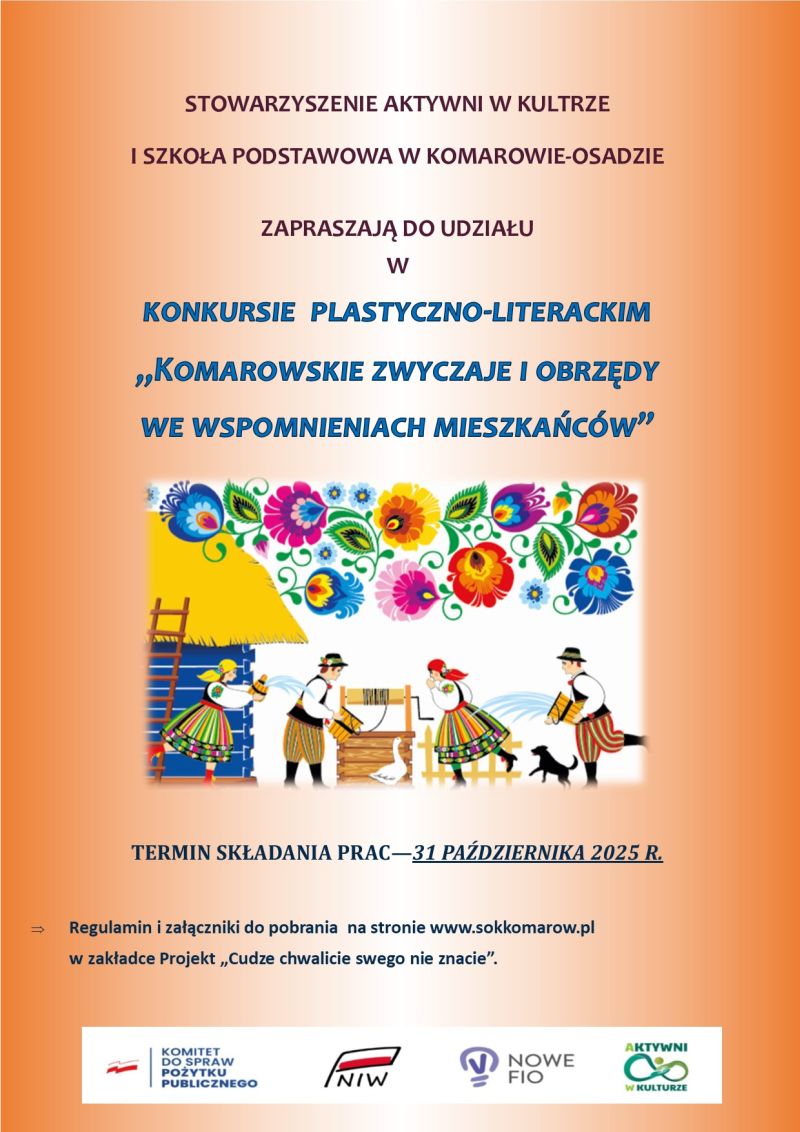 Najnowszą propozycją w ramach tego przedsięwzięcia jest konkurs plastyczno-literacki "Komarowskie zwyczaje i obrzędy we wspomnieniach mieszkańców". Chodzi na przykład o malowanie pisanek, święcenie pokarmów w Wielką Sobotę, rodzinne śpiewanie kolęd, dawne gry i zabawy, wicie wieńców dożynkowych, wesela czy sposoby na spędzanie wolnego czasu, zasłyszane od dziadków lub rodziców. Plastycznie, w formie rysunku, grafiki czy obrazu, mogą o tym opowiedzieć dzieci w wieku od 4 do 12 lat. Starsi, co najmniej 13-letni autorzy, mogą spisać uzyskane informacje w formie wywiadu, opowiadania, relacji czy reportażu.