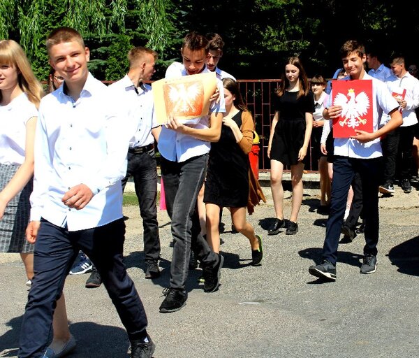 Wszyscy w odświętnych strojach i z symbolami narodowymi wyruszyli w asyście miejscowych strażaków na boisko szkolne, gdzie zatańczyli poloneza.