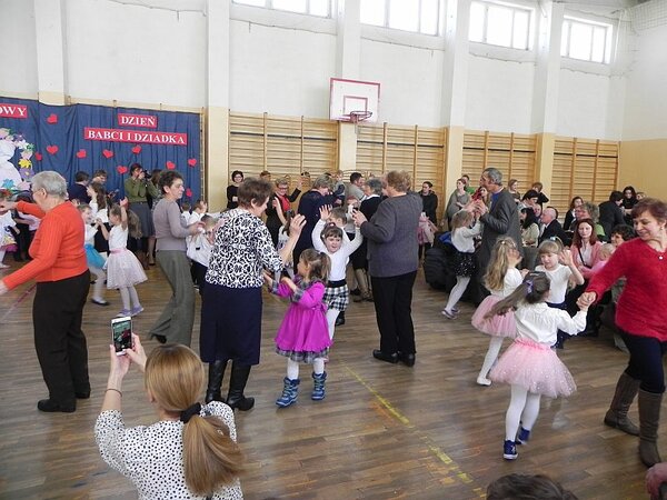 Na zakończenie uroczystości babcie i dziadkowie ruszyli ze swoimi wnukami do tańca i szkolna hala zamieniła się w karnawałową salę balową.