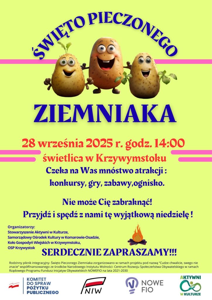 Festyn pod hasłem "Święto pieczonego ziemniaka" to najnowsza propozycja Stowarzyszenia "Aktywni w kulturze" z Komarowa-Osady w ramach projektu dofinansowanego z Programu Fundusz Inicjatyw Obywatelskich. Impreza odbędzie się w niedzielę 28 września.