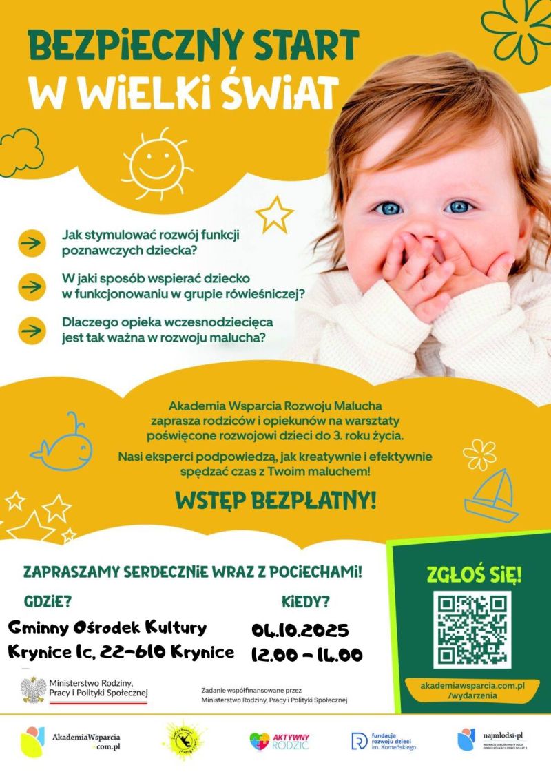 Pierwsze trzy lata są najważniejsze w rozwoju dziecka, ponieważ to wtedy następuje intensywny rozwój fizyczny, emocjonalny i społeczny. Rodzice maluchów z gminy Krynice, którzy chcą się dowiedzieć jak maksymalnie wykorzystać ten czas, mogą wziąć udział w bezpłatnych warsztatach, planowanych na najbliższy weekend.