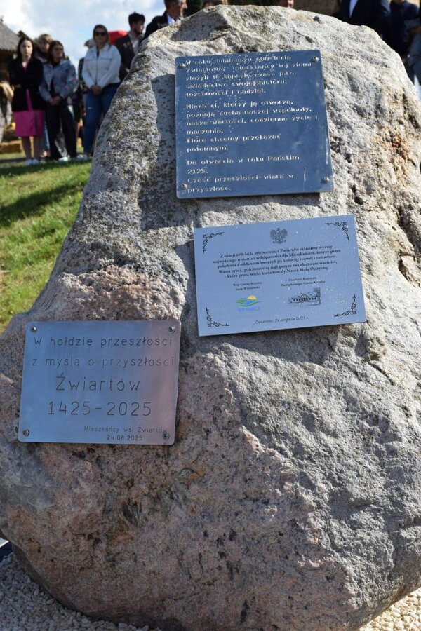 O jubileuszu będzie przypominać tablica, która została odsłonięta na placu przy miejscowej szkole. Pod obeliskiem została umieszczona "kapsuła czasu", w której znalazły się m.in. pendrive z dawnymi i współczesnymi zdjęciami Zwiartowa, wydanie "Krynickich wieści" oraz rys historyczny miejscowości. Tekst powstał na podstawie źródeł archiwalnych oraz wspomnień i relacji najstarszych mieszkańców, a podczas niedzielnej uroczystości odczytał go radny Janusz Iskierka.