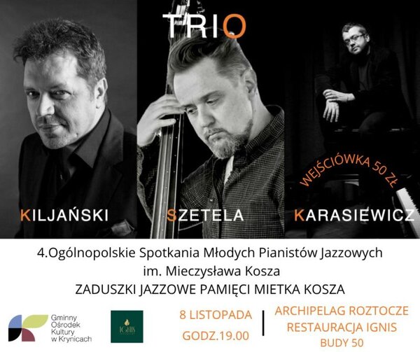 Miłośnicy jazzu, którzy nie chcą przegapić muzycznej uczty, jaką będą "Zaduszki jazzowe" w Budach w gminie Krynice, mogą jeszcze zdobyć wejściówki na wydarzenie, podsumowujące czwarte Ogólnopolskie Spotkania Młodych Pianistów Jazzowych im. Mieczysława Kosza. Finałowi, który odbędzie się 8 listopada, będzie towarzyszyć koncert Krzysztofa Kiljańskiego, Bartka Szeteli i Rafała Karasiewicza.