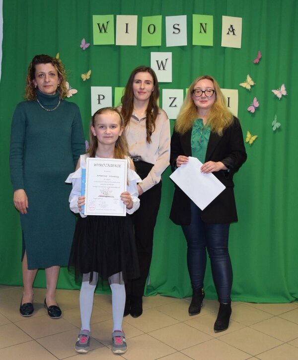 Uczestników tegorocznego konkursu "Wiosna w poezji" oceniały - nauczycielka i bibliotekarka z ZSP w Krynicach Sylwia Bajan, laureatka wielu konkursów recytatorskich Magdalena Olchawa i nauczycielka NSP w Hucie Dzierążyńskiej Dominika Radlińska.