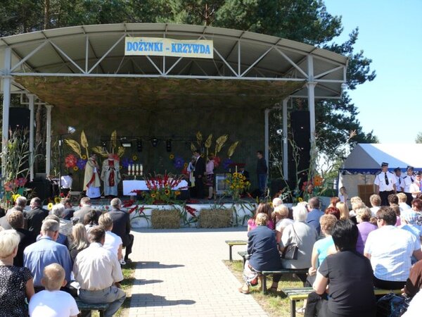 Rozstrzygnięcie konkursów wieńców było jednym z wielu elementów dożynek, które odbyły się na terenie Gminnego Ośrodka Sportu i Rekreacji w Krzywdzie.
