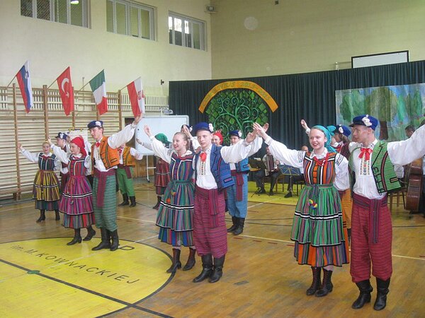 Pierwszy dzień pobytu rozpoczęło oficjalne powitanie międzynarodowej grupy przez dyrektor szkoły w Krzywdzie Ewę Latoch-Sprychę i koordynatorkę projektu Alicję Pietrzak oraz uczniowskie występy wokalistów i instrumentalistów. Zanim zagraniczni goście rozpoczęli zwiedzanie placówki obejrzeli też pokaz gimnastyczny i taneczny oraz prezentacje multimedialne związane z tematami projektu, które przygotowały Patrycja Gajo, Julia Wesołowska i Paweł Sprycha. Młodzież i ich opiekunowie byli też w lesie i w hucie szkła. Podczas spotkania z leśniczym Jackiem Mazurem, zobaczyli jak wygląda wycinka drzew i nowe nasadzenia, a także poznawali budowę lasu i rodzaje drzew. Miejscowa huta szkła nie jest tradycyjnym tego typu zakładem, ponieważ do produkcji nie używa się tu żadnych środków chemicznych, a tylko szkło pochodzące z recyclingu. Tego samego dnia międzynarodowa grupa obejrzała jeszcze pokaz psich umiejętności w wykonaniu zwierząt ze Stowarzyszenia Przyjaciół Zwierząt "Czaruś" w Łukowie oraz polskie tańce ludowe w wykonaniu zespołu "Łukowiacy". Szkoły, uczestniczące w projekcie przygotowały też własne stroje narodowe i krótkie układy taneczne.