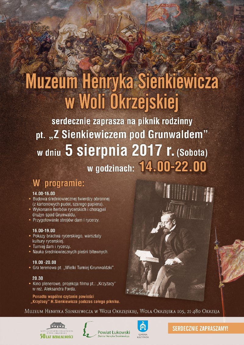 Do udziału w pikniku zaprasza Muzeum Henryka Sienkiewicza w Woli Okrzejskiej, które świętuje jubileusz 50-lecia oraz jego partnerzy - Gmina Krzywda i Powiat Łukowski.