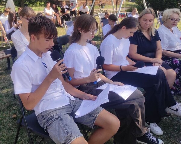 Mimo upału plenerowe czytanie "Kordiana" przy fontannie w Krzywdzie zgromadziło około 70 miłośników literatury.