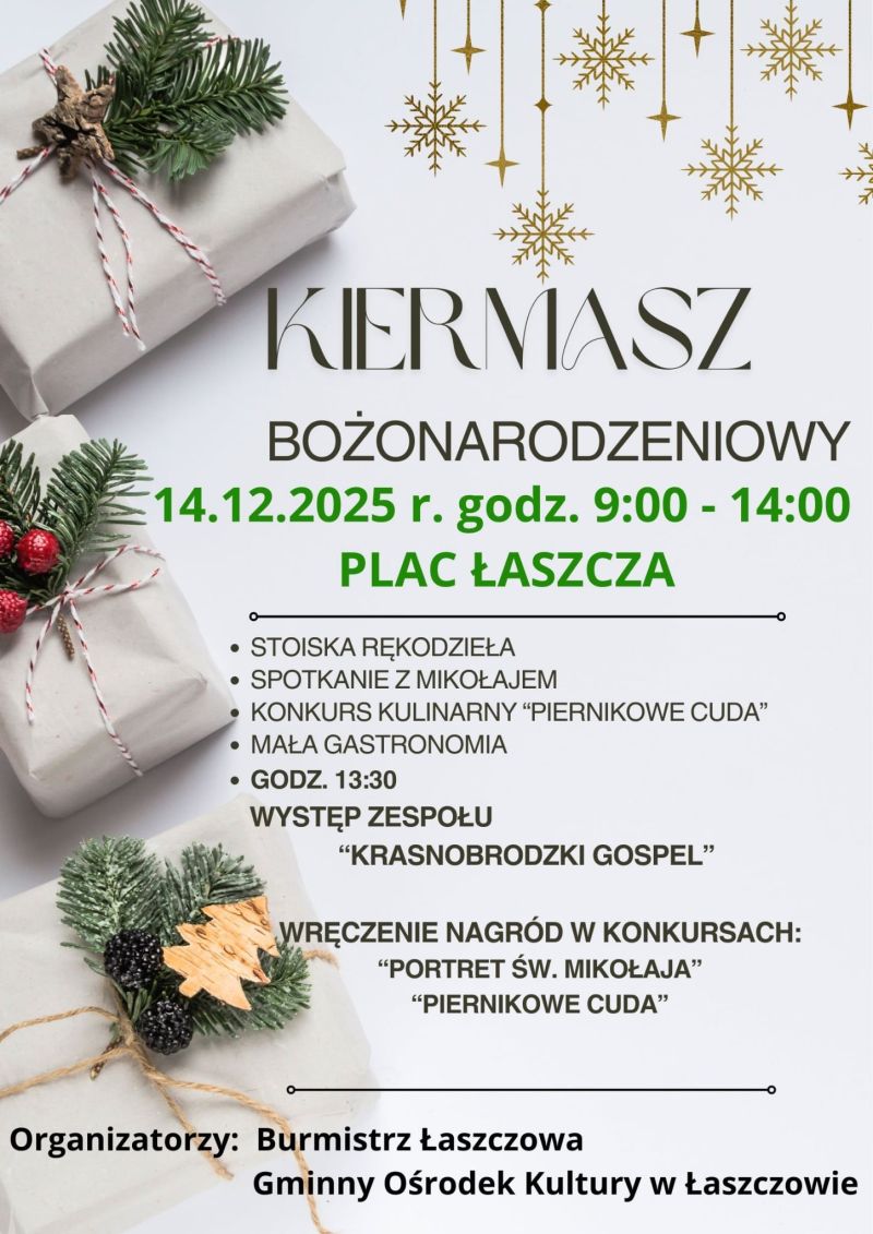Trwają ostatnie przygotowania do Kiermaszu Bożonarodzeniowego w Łaszczowie. Organizatorzy właśnie zamknęli listę wystawców i kończą świąteczne konkursy, a gości na zakupy i laureatów po nagrody zapraszają w niedzielę 14 grudnia na Plac Łaszcza.