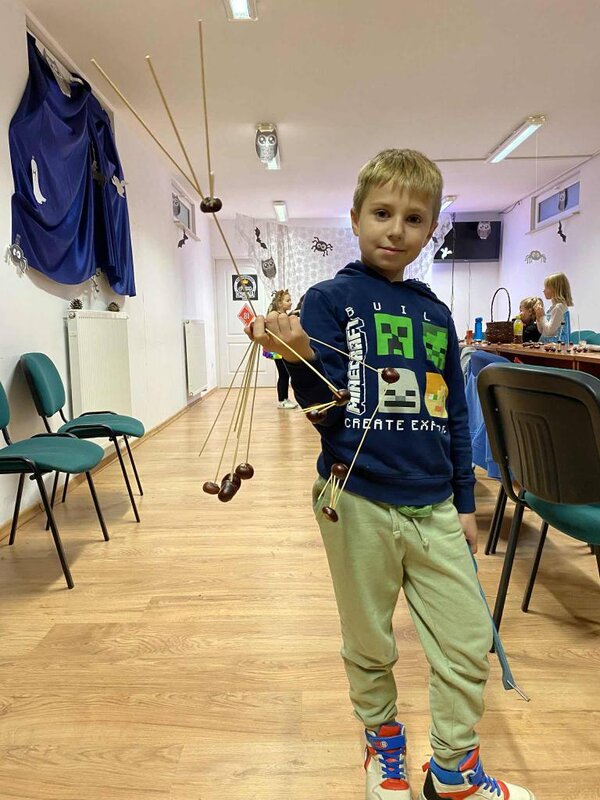 Magiczny klimat spotkania podkreślało odpowiednie oświetlenie i dym, a dopełnieniem programu były warsztaty tworzenia kasztanowych stworów, które okazały się kapitalnym przykładem pomysłowości i zręczności uczestników zajęć.