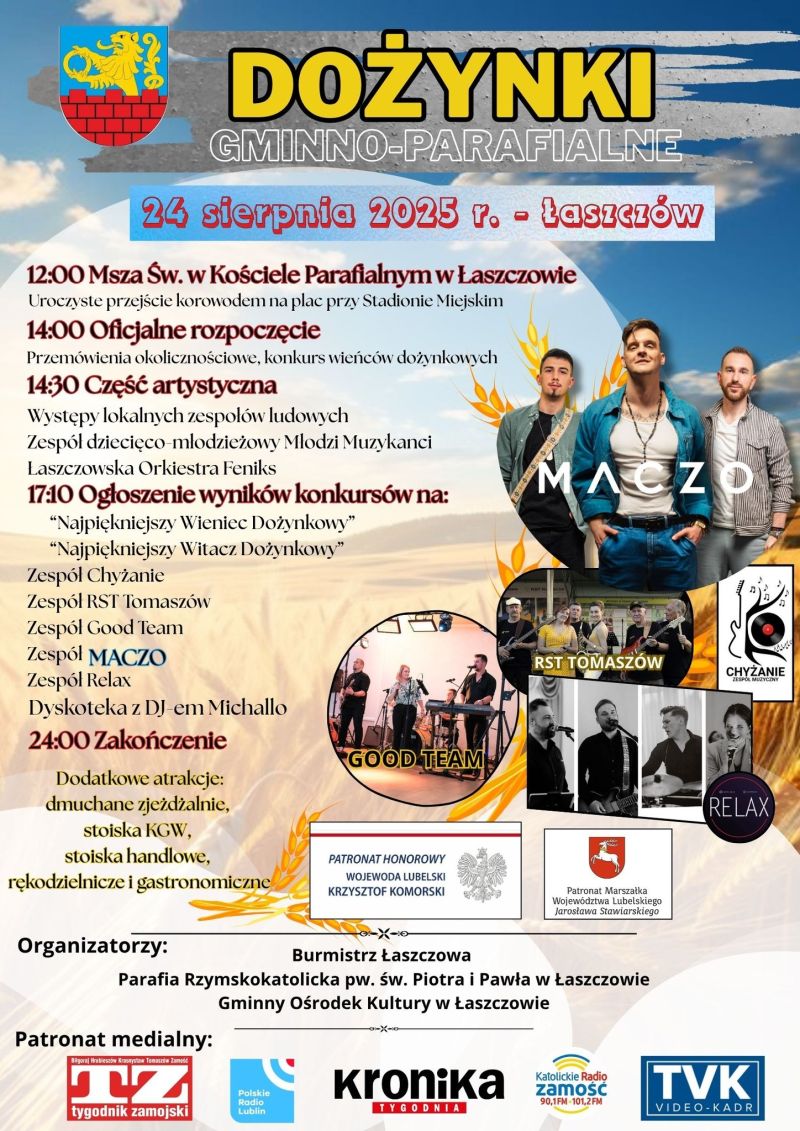 Kończą się przygotowania do Dożynek Gminno-Parafialnych w Łaszczowie . Organizatorzy już zamknęli listę uczestników konkursów na wieniec i witacz, wybrali starostów i ogłosili listę gwiazd, które będą bawić publiczność w niedzielę 24 sierpnia.
