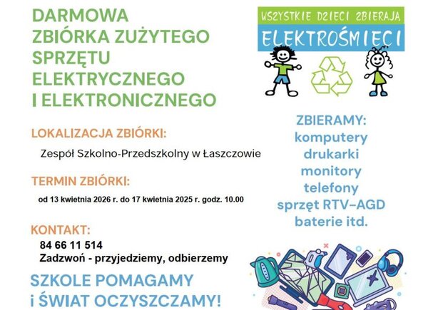 Zespół Szkolno-Przedszkolny w Łaszczowie ma szanse na kolejne nagrody za elektrośmieci. Zbiórka starych urządzeń elektrycznych i elektronicznych rozpocznie się w poniedziałek 13 kwietnia i potrwa tydzień.