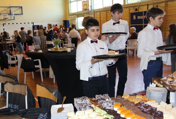 Oprócz uczty duchowej goście raczyli się ciastami, kawą i napojami, które sprzedawały mamy z Rady Rodziców, a do stolików pyszności serwowali chłopcy z klas VI - VIII, którzy wystąpili jako kelnerzy. Uczniów w odświętnych uniformach i z nienagannymi manierami do nowej roli przygotowali profesjonalni instruktorzy z Gościńca pod Lasem w Grabowcach Dolnych, który pomógł również w organizacji całej uroczystości.