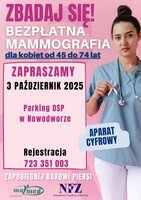 Najbliższe bezpłatne badania mammograficzne w Nowodworze odbędą się jutro, ale limit miejsc jeszcze nie został wyczerpany. Pacjentki wciąż mogą się zapisać na wizytę w mammobusie, który będzie czekać na nie w piątek 3 października na parkingu miejscowej jednostki Ochotniczej Straży Pożarnej od 8.00.