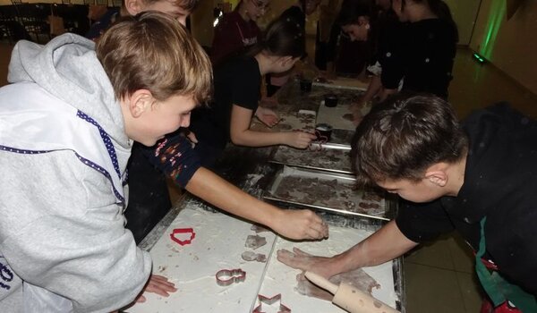 Młodzi cukiernicy poznali zasady wypieku pierników, wałkowali ciasto, a potem za pomocą świątecznych foremek wykrawali różne kształty pierniczków, które po upieczeniu dekorowali.