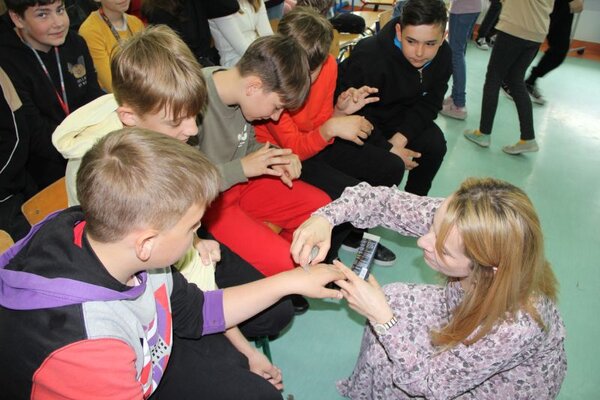 Oprócz wiedzy teoretycznej uczniowie mieli okazję do sprawdzenia informacji w praktyce. Na zakończenie prelekcji skorzystali z bezpłatnego peelingu dłoni.