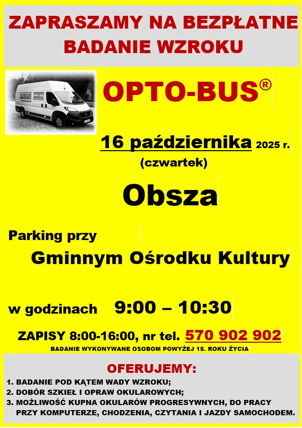 Mieszkańcy gminy Obsza mogą się jeszcze zapisywać na bezpłatne badania wzroku, które odbędą się w tym tygodniu na placu przy miejscowym ośrodku kultury. Specjaliści będą do dyspozycji w czwartek 16 października między 9.00 a 10.30.