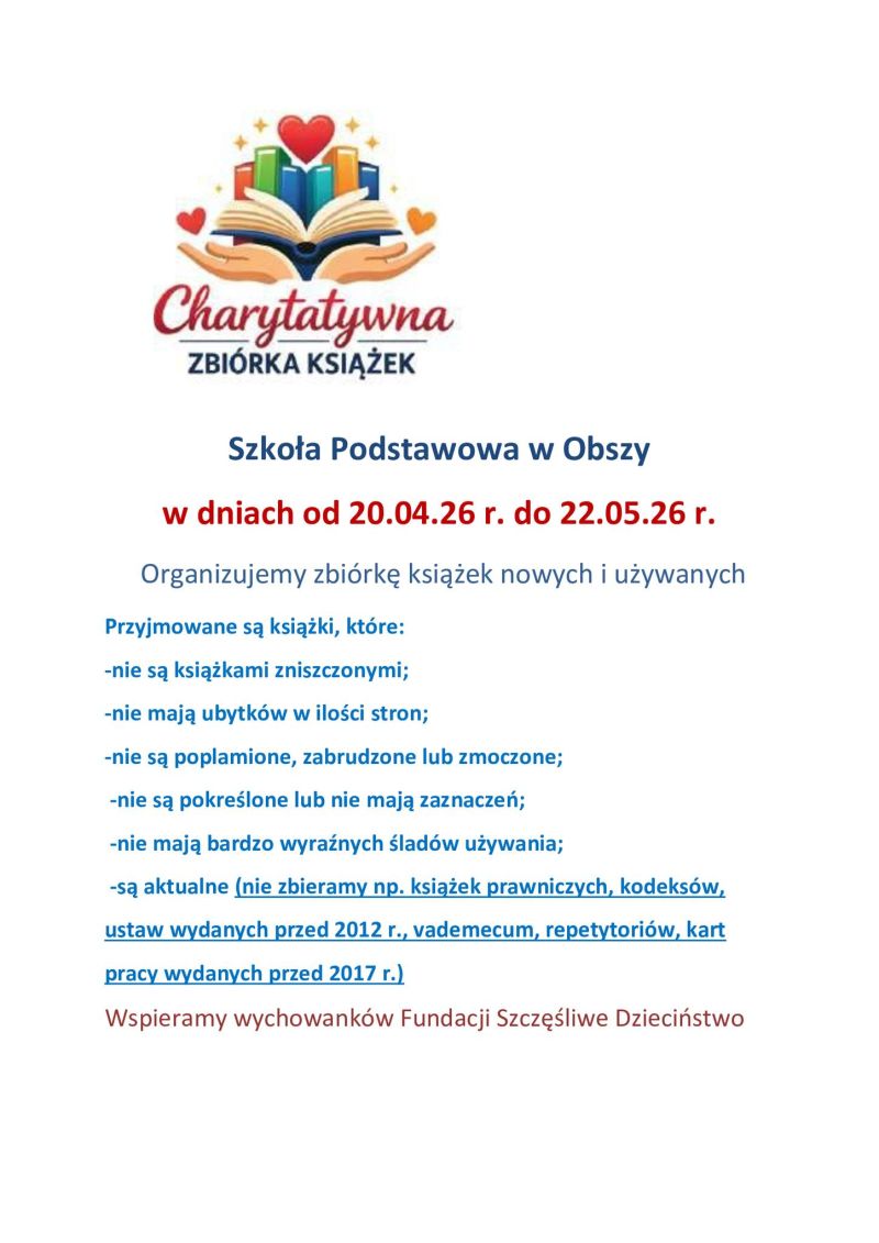 Przeczytane, ale niezniszczone książki mogą dać chwile radości nowym czytelnikom. Wychodząc z takiego założenia uczniowie i pracownicy Szkoły Podstawowej w Obszy chcą wesprzeć podopiecznych Fundacji Szczęśliwe Dzieciństwo.