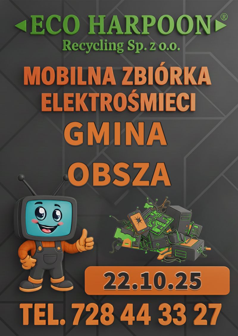 Mieszkańcy gminy Obsza mają kolejną w ostatnich tygodniach okazję pozbycia się w legalny i łatwy sposób elektrośmieci. Po mobilne zbiórce, która odbyła się w pierwszych dniach września, najbliższa akcja jest planowana na środę 22 października.
