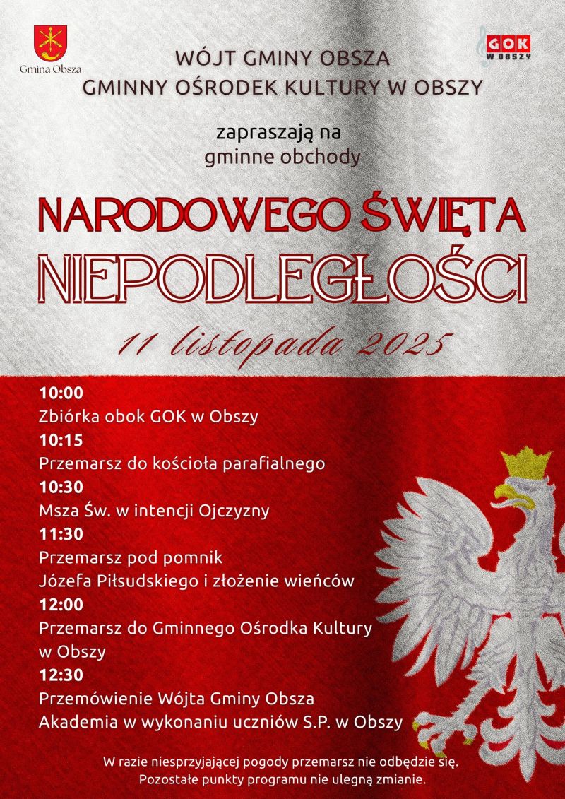 Tradycyjny charakter będą mieć obchody Święta Niepodległości w Obszy. We wtorek 11 listopada mieszkańcy spotkają się przy pomniku Marszałka Józefa Piłsudskiego i na akademii w miejscowym ośrodku kultury, a uroczystości poprzedzi msza święta za ojczyznę.