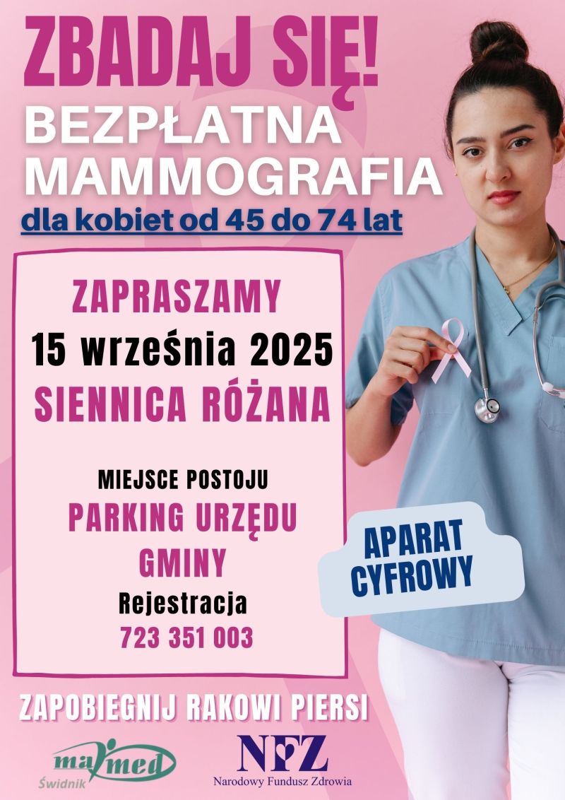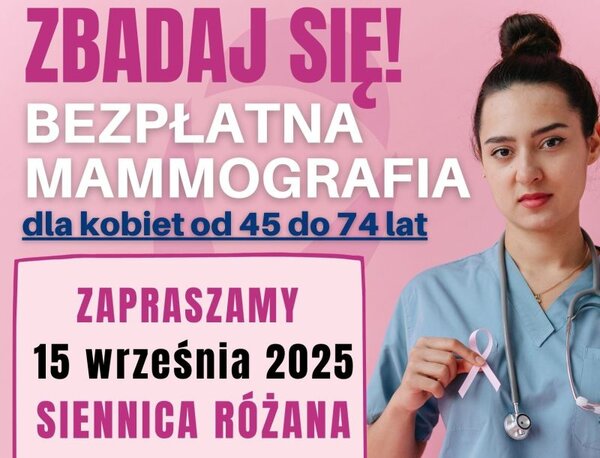 Mammografia pozwala na wykrycie zmian chorobowych, których nie można zaobserwować podczas samokontroli piersi, a wcześnie wykryty nowotwór umożliwia skuteczne leczenie i daje niemal 100-procentową gwarancję powrotu do zdrowia. W przyszłym miesiącu szansę na wykonanie badania bezpłatnie i na miejscu będą mieć mieszkanki gminy Siennica Różana.