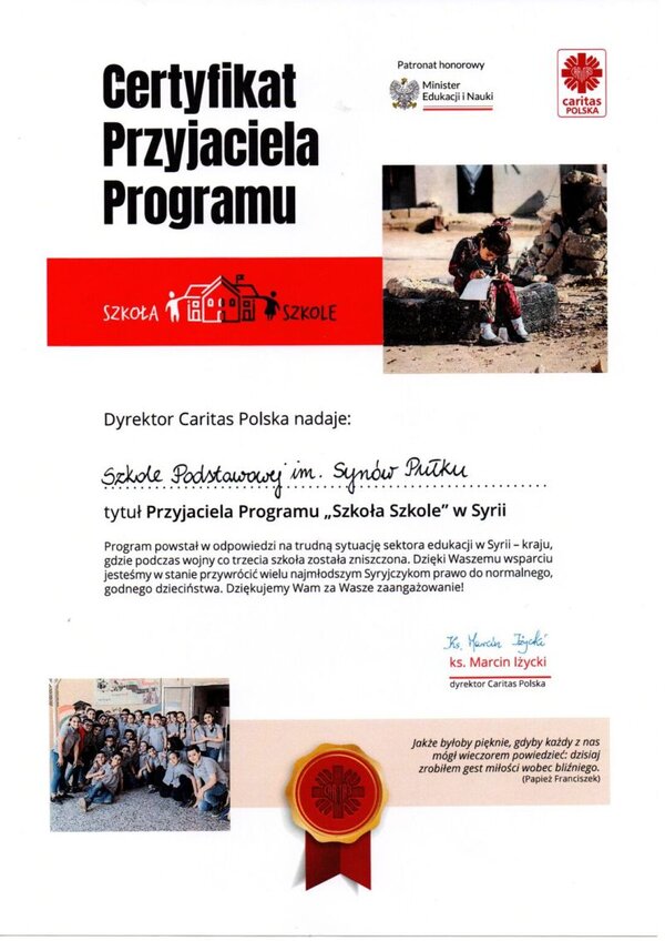 W ramach programu placówki z całej Polski przekazują jednorazowe lub stałe wsparcie na rzecz szkół w Syrii, które ucierpiały w trakcie konfliktu zbrojnego lub klęski żywiołowej. w latach 2018 - 2021 pomoc trafiła do 9 placówek w Syrii. Pieniądze zostały wykorzystane m.in.: na remonty klas oraz zakup pomocy dydaktycznych i sprzętu elektronicznego.