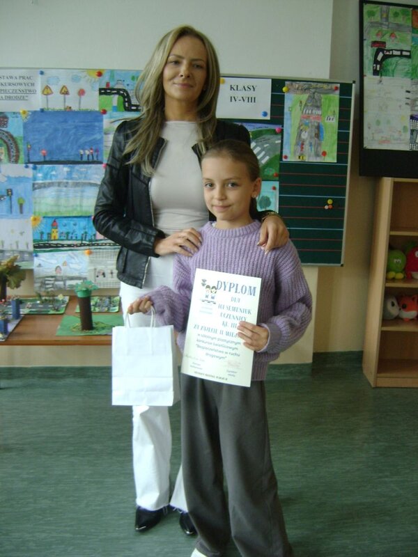 Konkurs plastyczny "Bezpieczeństwo w ruchu drogowym" był jednym z elementów akcji "Bezpieczni na drodze", organizowanej w ramach ogólnopolskiego konkursu "Odblaskowa szkoła". Akcję rozpoczęły zajęcia edukacyjne, które odbywały się we wszystkich klasach i w szkolnej świetlicy. Uczniowie rozmawiali o zasadach bezpiecznego poruszania się po drodze, poznawali znaki drogowe i numery telefonów alarmowych, przekonywali się dlaczego warto zakładać kamizelki i opaski odblaskowe, a pomogły w tym filmy, pokazujące jak kierowcy widzą pieszych w dzień i w nocy.