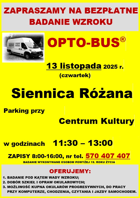 Opto-Bus przyjedzie w czwartek 13 listopada i będzie do dyspozycji pacjentów na parkingu przy Centrum Kultury w Siennicy Różanej między11.30 a 13.00, ale na wizytę trzeba się zapisać. Można to zrobić od 8.00 do 16.00 telefonicznie pod numerem: 570 407 407.