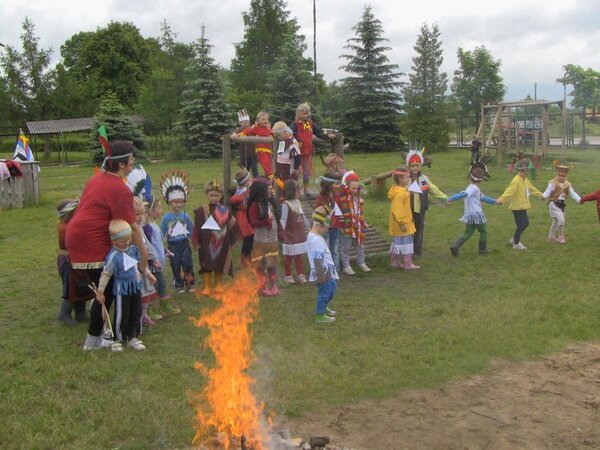 Wodzowie przedszkolnych i szkolnych szczepów, panie Urszula, Alina i Joanna, przygotowały zabawy typowo indiańskie, ale też i takie, które dzieci znały z codziennych zajęć. Jak każe tradycja, główną atrakcją zabaw małych Apaczów, Czejenów czy Arapaho, było spotkanie przy ognisku.