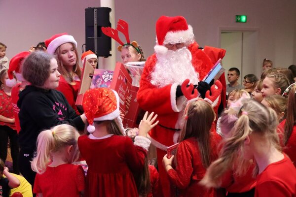 Na kolejną część piątkowego spotkania najbardziej czekały grzeczne dzieci, które zostały obdarowane upominkami od Świętego Mikołaja. Święty miał tak dużo pracy, że musiał skorzystać ze wsparcia pomocników.