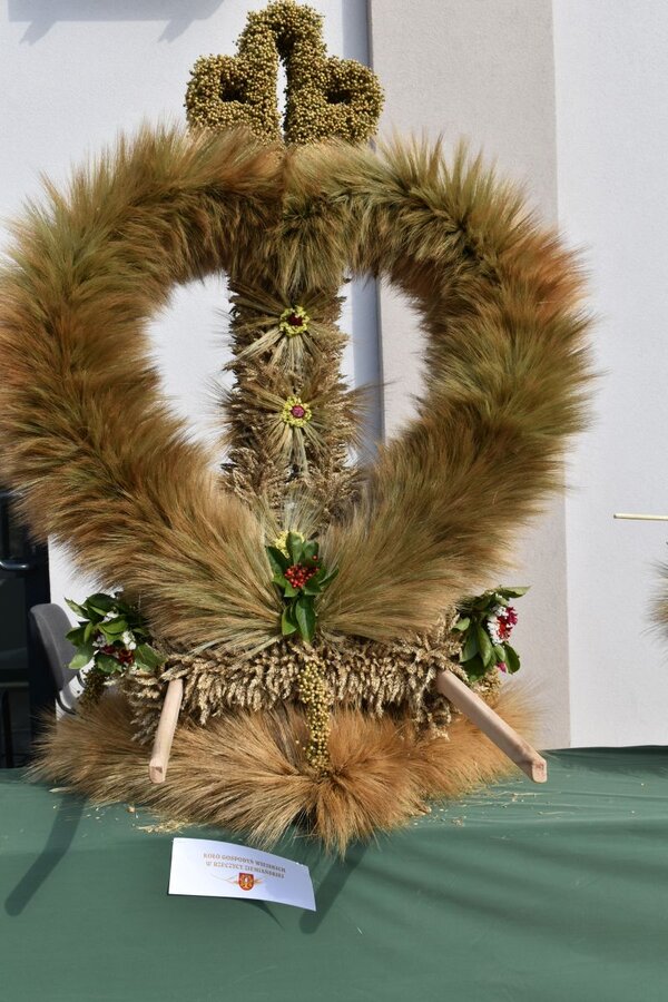 Tradycyjnym, ludowym elementem święta była prezentacja i ośpiewanie wieńców dożynkowych, które wzięły udział w dorocznym konkursie. Członkowie komisji byli pod wrażeniem zgłoszonych kompozycji, a pierwsze miejsca przyznali, za wieniec tradycyjny - KGW z Rzeczycy Ziemiańskiej, a za wieniec współczesny - KGW z Łychowa Szlacheckiego. Tradycyjna kompozycja ma kształt serca zwieńczonego krzyżem. Wieniec został uwity z pszenicy, jęczmienia, owsa i żyta oraz przybrany kwiatami z trawą i lnem. Współczesny wieniec ma kształt koła. W środku ze zbóż został odwzorowany wiejski krajobraz z chatą, drzewami, ogrodem i różnobarwnymi polami. Za wieńce tradycyjne, oprócz pierwszej nagrody, jurorzy przyznali jeszcze dwie drugie, które otrzymały - Koło Gospodyń Wiejskich w Węglinie i Koło Gospodyń Wiejskich "Sąsiedzi" w Budkach. Drugie miejsce w konkursie współczesnych kompozycji zajęła Grupa Koleżanek z Rzeczycy Księżej, a na trzecie nagrody zasłużyły koła z Woli Trzydnickiej, Łychowa Gościeradowskiego i Węglinka oraz świetlica w Łychowie Gościeradowskim.