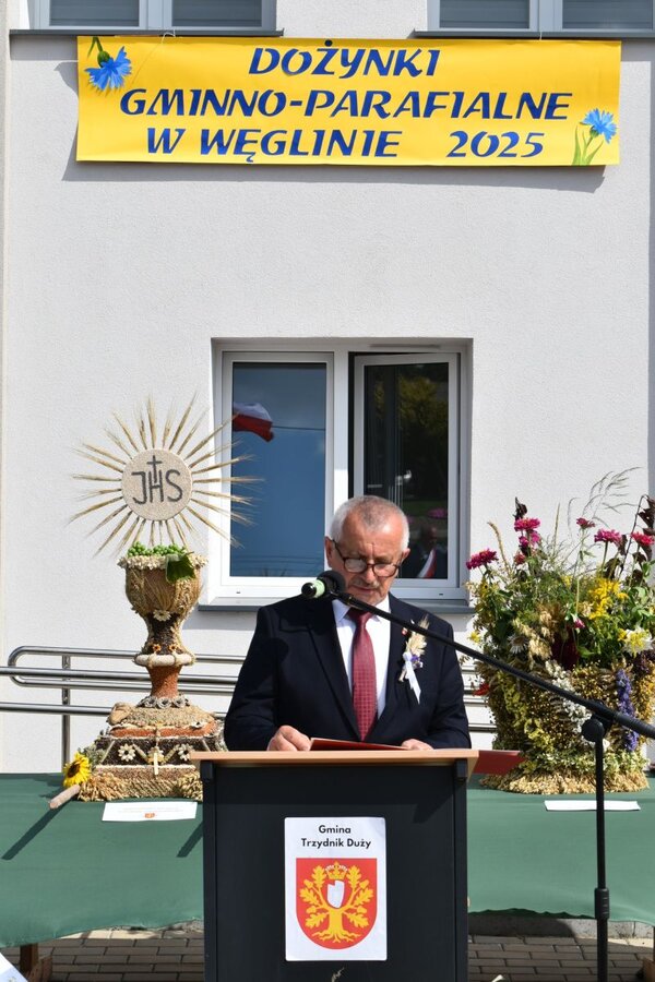 Po nabożeństwie barwny korowód dożynkowy z pocztami sztandarowymi Gminy Trzydnik Duży i Rejonowego Koła Pszczelarzy Trzydnik Duży-Zaklików przeszedł na plac przy remizie OSP Węglin, gdzie wójt Krzysztof Serafin odebrał od starostów poświęcony chleb i podziękował wszystkim rolnikom za ich pracę. W imieniu starosty kraśnickiego Zbigniewa Dżugaja słowa uznania dla gospodarzy przekazał członek zarządu powiatu Henryk Flis, a wśród gości był również radny powiatowy Damian Kowalski, reprezentujący na uroczystości wicewojewodę lubelskiego Andrzeja Maja.