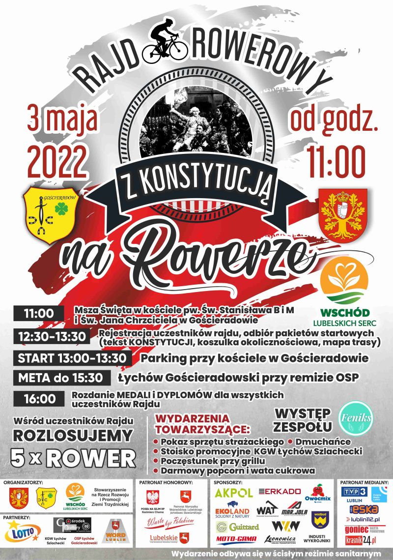 W przyjemnej atmosferze można poznać ciekawe zakątki dwóch gmin, a przy okazji aktywnie uczcić rocznicę uchwalenia konstytucji i wygrać… rower. We wtorek 3 maja odbędzie się Rajd "Z Konstytucją na rowerze", którego uczestnicy przejadą trasą wiodącą przez gminy Trzydnik Duży i Gościeradów.