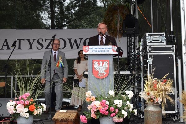 Delegacje wszystkich gmin zebrały się na placu targowym, gdzie dożynkowych gości powitali gospodarze niedzielnej uroczystości - burmistrz Tyszowiec Robert Bondyra i starosta tomaszowski Henryk Karwan. Zwracając się do zebranych Robert Bondyra podkreślił, że w polskiej historii i tradycji wieś i trud rolnika zawsze zajmowały ważne miejsce. Burmistrz zwrócił też uwagę, że tak naprawdę praca w gospodarstwach rolnych nigdy się nie kończy, ale koniec żniw daje rolnikom wytchnienie. - Na polach jeszcze tyle fasoli, buraków, kukurydzy, dyni, papryki i kapusty. Czy wrócą te czasy gdy zebrane plony będą bezpiecznie leżały w magazynach, a punkty skupujące będą biły się, by kupić je od rolników? - pytał publicznie burmistrz Tyszowiec. Jednocześnie podziękował rolnikom za ich wysiłek, wyrażając nadzieję, że chleba wypieczonego z tegorocznych zbóż nie zabraknie w żadnym domu. - Bo ten chleb jest mój i twój, wasz i nasz, bez względu na poglądy, podziały, dzisiaj jesteśmy wszyscy razem, razem stoimy za naszymi tomaszowskimi rolnikami. W okazałych i misternie wykonanych wieńcach dożynkowych kryje się nie tylko radość z pomyślnie zakończonych żniw, ale przede wszystkim mozolna praca i codzienna troska mieszkańców wsi - mówi Robert Bondyra.